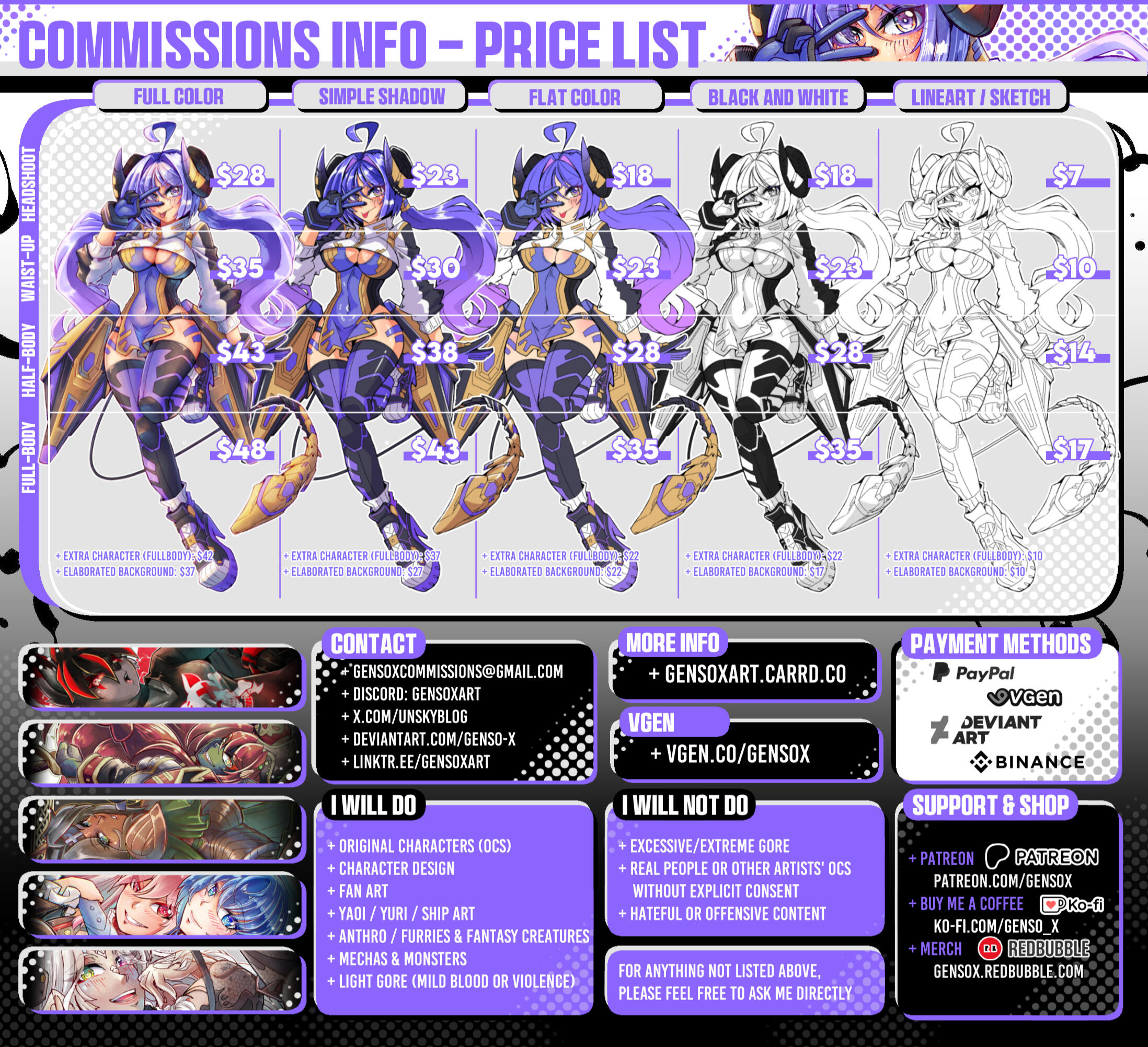 8 - I make SFW and NSFW commissions, andI accept requests for drawings of: OC's, Fan-arts, character designs, anthro, mechas and monsters. I do not make NSFW drawings with the theme of infants, elderly, Yaoi or gore, if you want to see a broader example of my work these are my galleries: